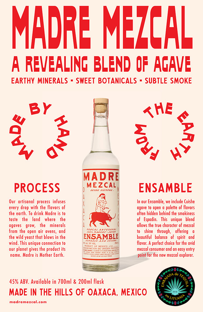 Įkūnijantis tikrąją Oaxaca valstijos dvasią, 'Madre Mezcal Ensamble' yra amatininkų meskalis, mažomis partijomis gaminamas rankomis po atviru dangumi, pagal tradicinius metodus ir šeimos receptą, paremtą šimtmečių distiliavimo išmintimi. Meskaliui būdingas santūrus dūminis charakteris, atveriantis gomurį saldžių ir mineralinių agavų natų tyrinėjimui. Puikiai subalansuotą ir labai kompleksišką meskalio charakterį kuria vietinis vanduo, ore esančios mielės, agavų skrudinimo krosnyje esantys mineralai ir skirtingų agavų skonių harmonija.